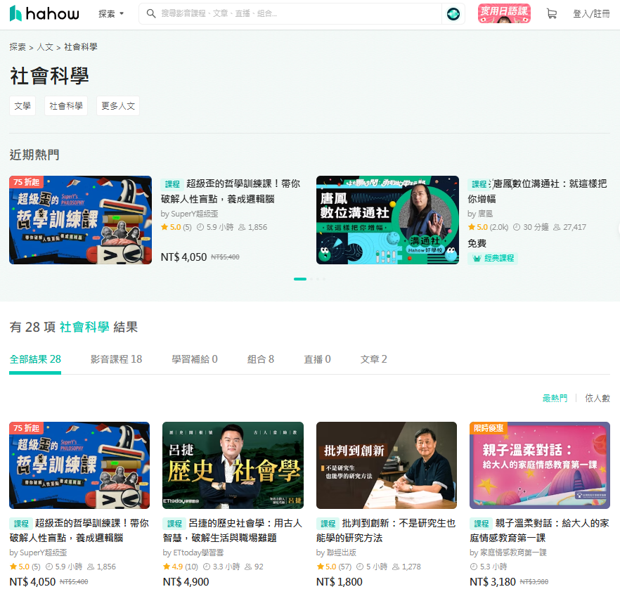 Hahow 課程種類多樣,社會科學也有知名名人開課