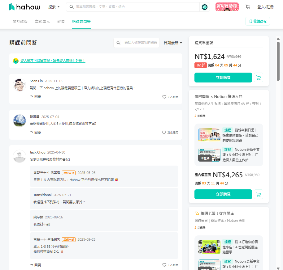 Hahow 的購課前問答讓有興趣的學員可以在消費前確認需求,對增加信賴有幫助
