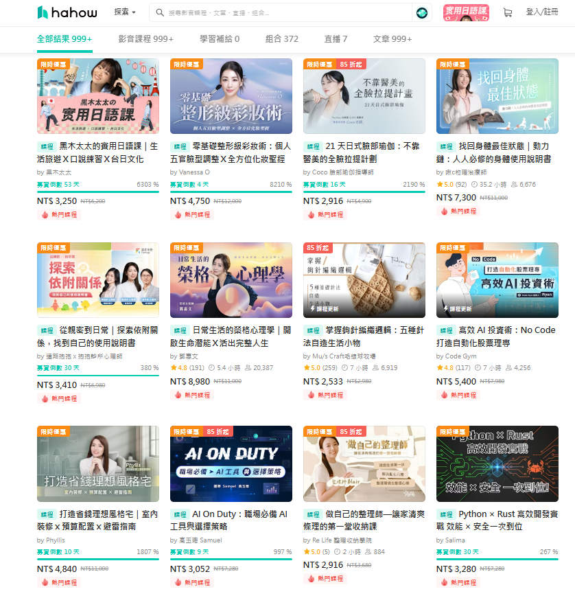 Hahow 好學校透過群眾募資與一次買斷的模式,為華語市場提供豐富且平價的線上課程。它適合喜歡自學、能自律安排時間或只想學單一技能的人。平台種類多元,從程式、設計到投資、語言應有盡有,讓初學者能用較低成本探索興趣。