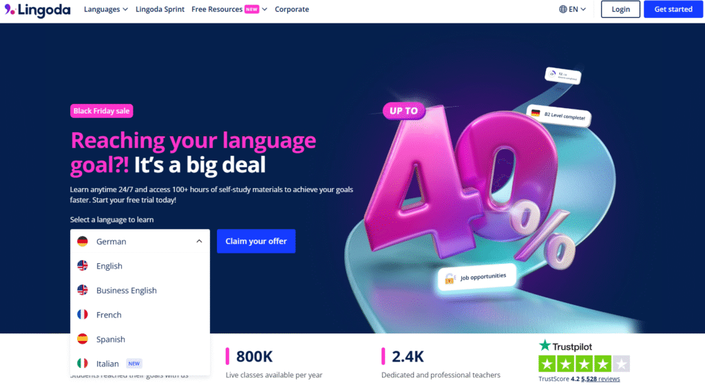 Lingoda 提供英語、德語、法語、西班牙語,並試驗性提供義大利語。每種語言均有小班制與一對一課程,及 Sprint 方案。