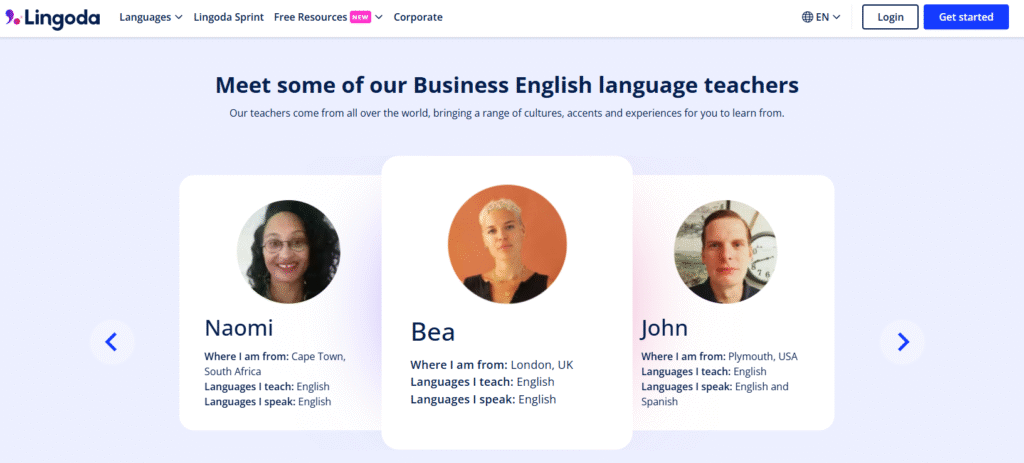 Lingoda 標榜所有教師擁有C2 語言水平或為母語人士,並具備 TESOL/TEFL 等教學證照。以商業英語來說,老師來自南非、英國與美國。