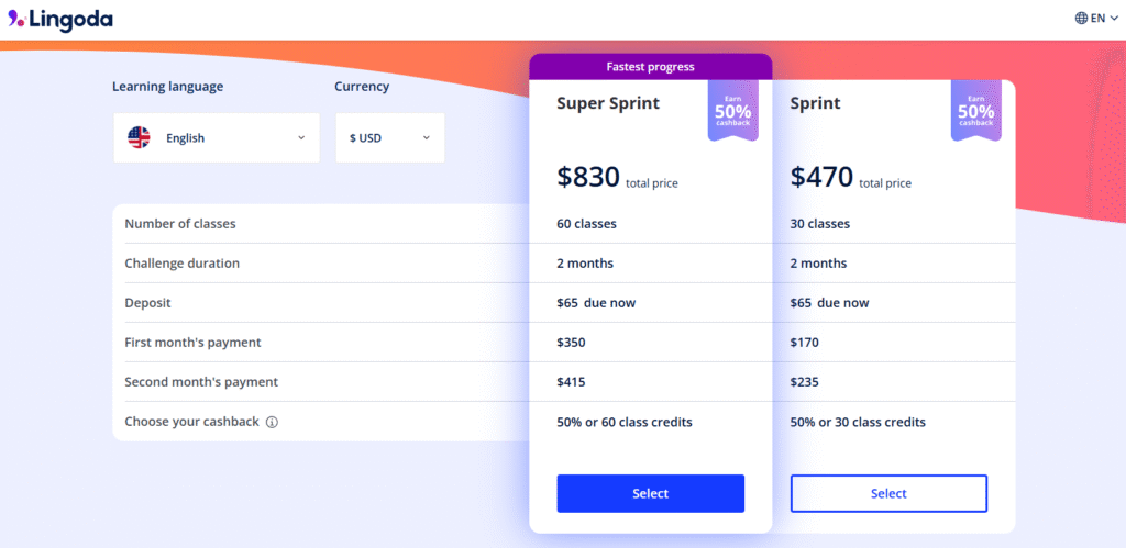 Lingoda Sprint 是超具話題性的方案:只要你能在 60 天內準時完成 30 堂課(Sprint)或 60 堂課(Super Sprint),就可以返還 50% 學費,或是課堂點數。Sprint 方案學生需預付美金 60 – 65 元的押金。以普通英文為例,Sprint 的方案與價格如下: