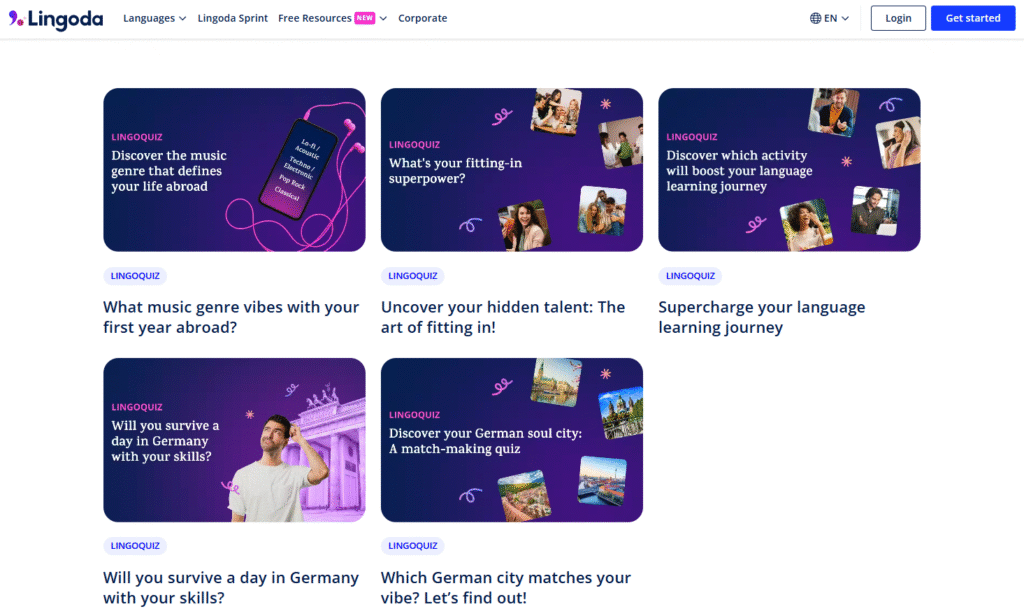 Lingoda 也提供了些許免費學習資源,比如他們的 LingoTalks 與 LingoQuiz ,用遊戲化的方法來讓用戶「微體驗」Lingoda,順便引介用戶加入 Lingoda。